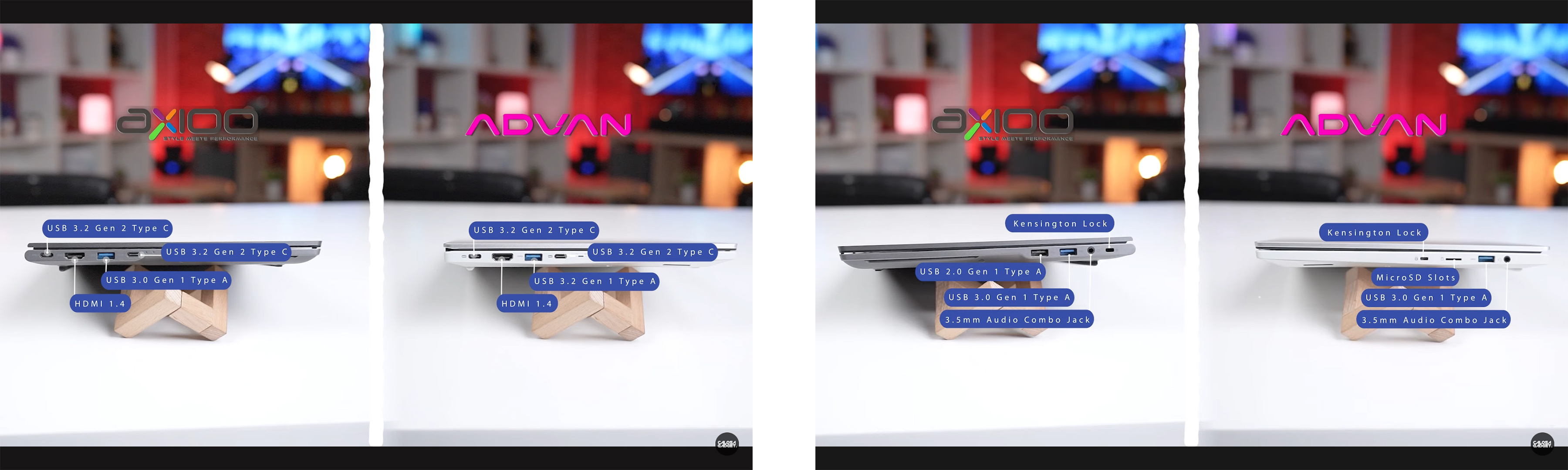 - Webcam: Axioo menang telak dengan resolusi 1080p @30fps, cocok untuk kebutuhan meeting online yang jernih. Advan masih menggunakan 720p, cukup, tapi tidak jernih rivalnya.