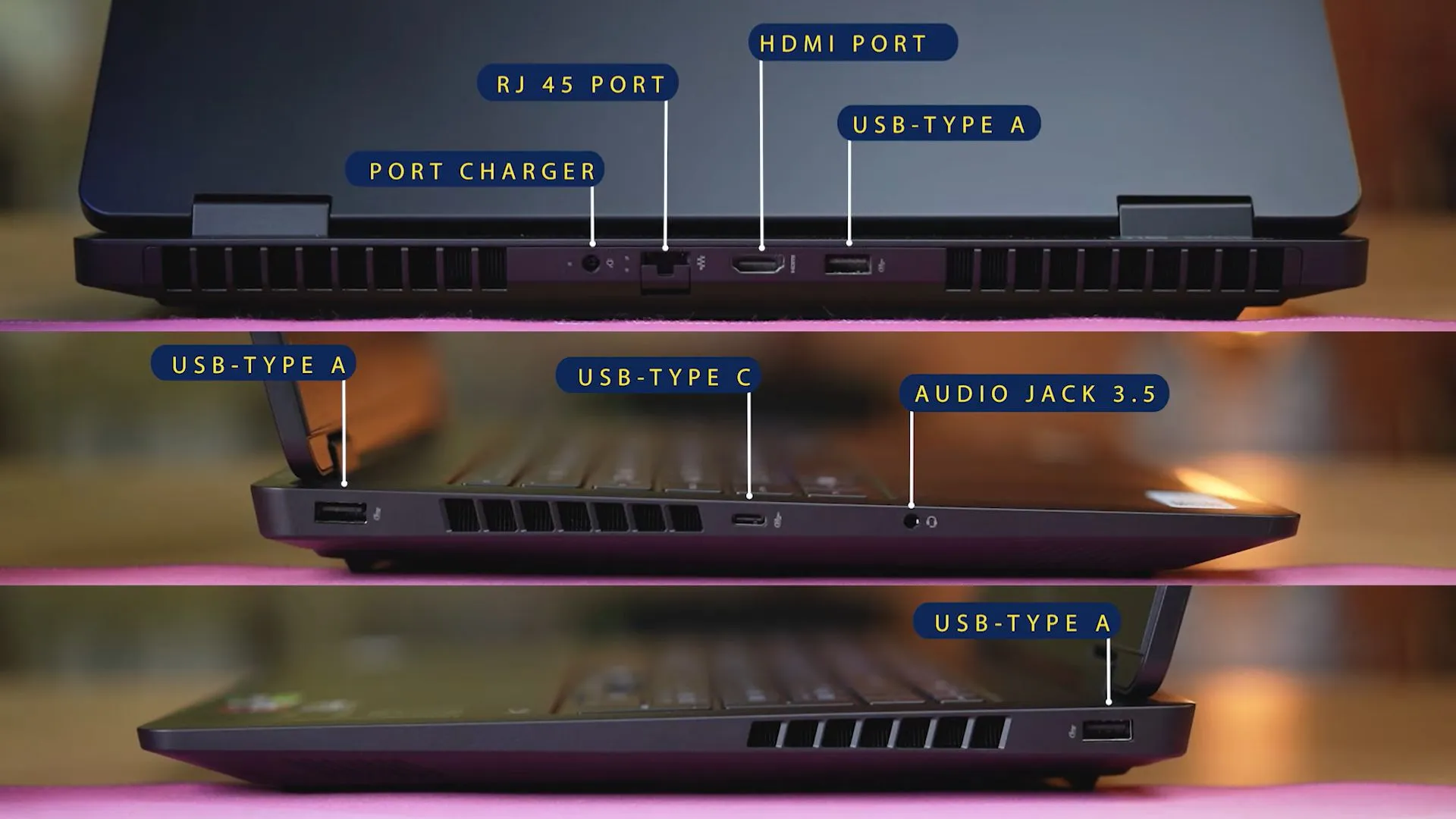 Untuk port di laptop ini tersebar di sisi kanan, kiri, dan belakang. Di sisi kanan tersedia satu USB Type-A. Di sisi kiri terdapat Audio Jack 3.5mm, USB Type- A dan USB Type-C. Sementara di bagian belakang tersedia Port Charger, RJ-45, HDMI, serta satu USB Type-A.
