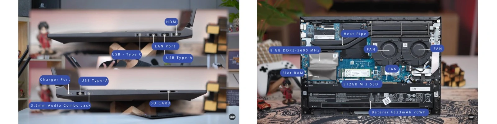 Dari segi konektivitas, Victus 15 dibekali port yang cukup lengkap di bagian samping kanan dan kiri. Mulai dari USB Type-C yang tersedia sudah mendukung DisplayPort 1.4 dan HP Sleep and Charge. Selain itu tersedia USB Type-A, HDMI 2.1, LAN port, audio jack combo, dan SD card reader. Semua port ini mendukung produktivitas sehari-hari. HP 15 juga menggunakan wifi 6 dan Bluetooth 5.3, webcam yang dipasang pada laptop ini memiliki resolusi 720p.