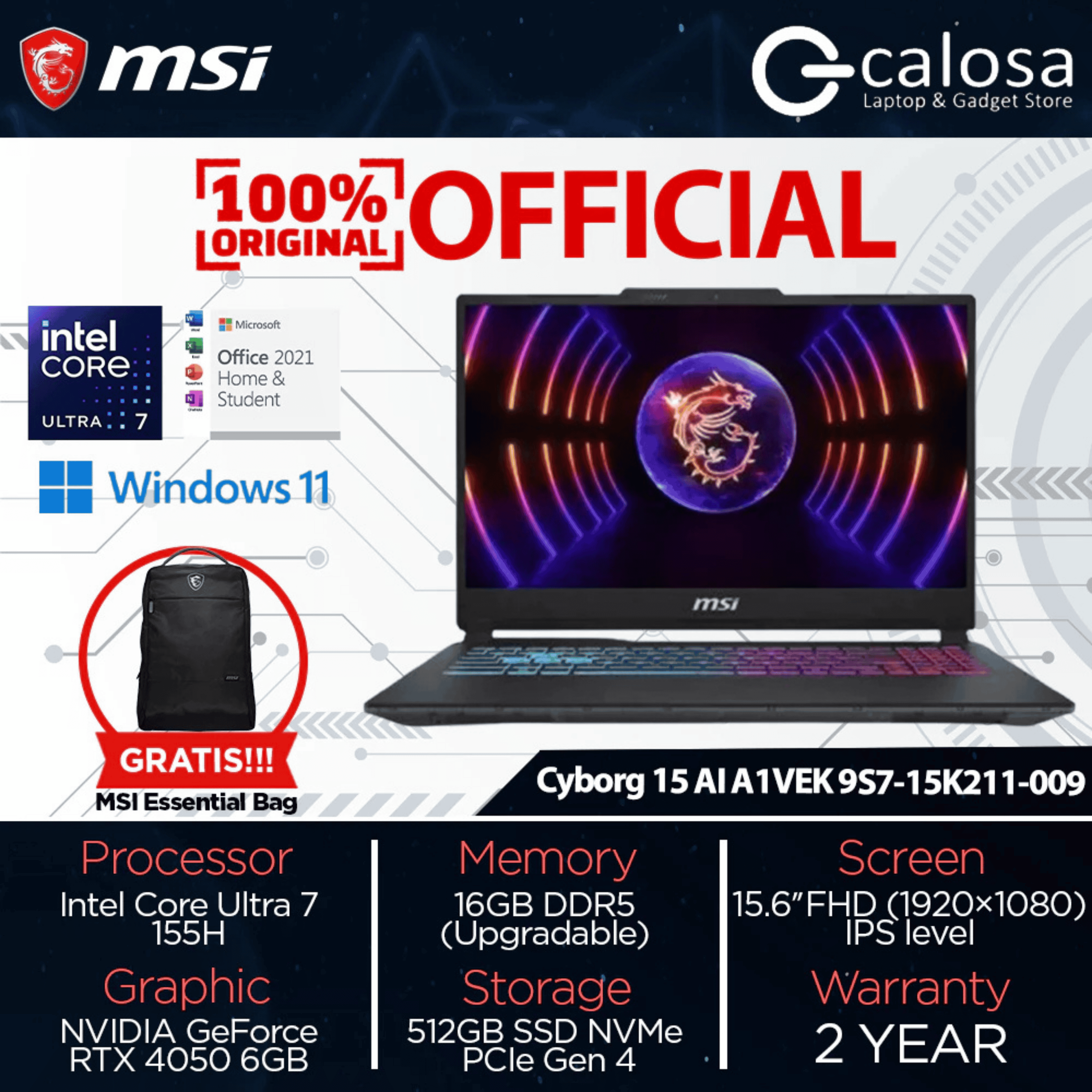 MSI Cyborg 15 AI A1VEK 9S7-15K211-009 ULTRA 7-155H 15.6'' RTX 4050 6GB WIN 11 BLACK