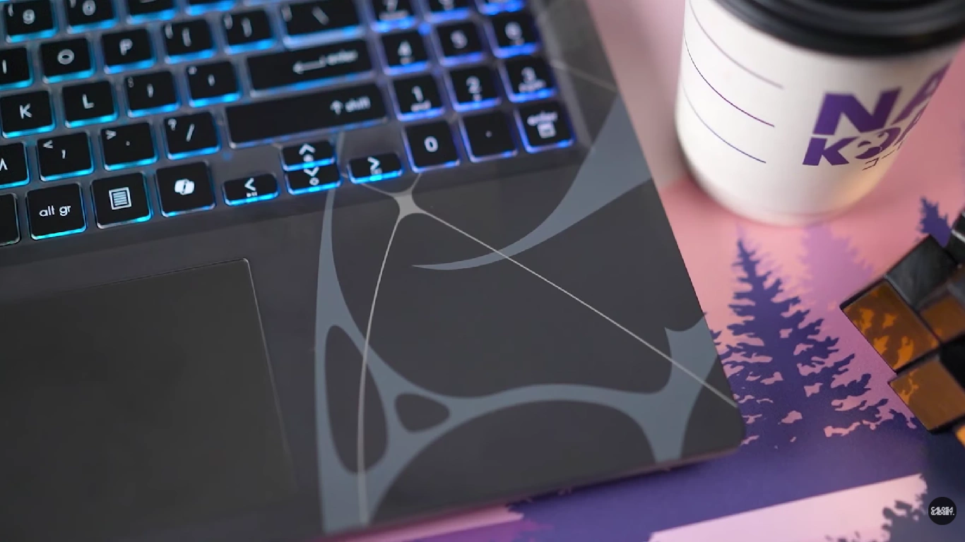 Ada juga pola splash abu-abu dan silver di palmrest dengan finishing doff, bikin tampilannya nggak terlalu norak tapi tetap keren.