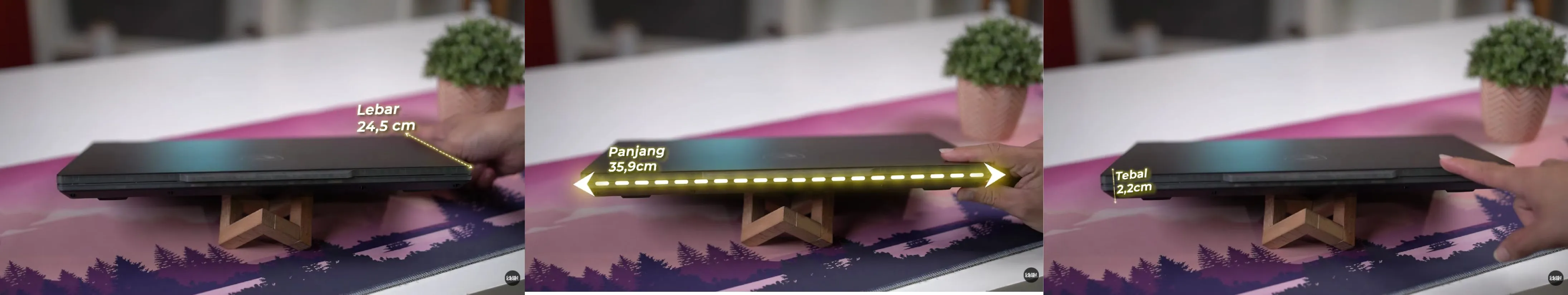 Ketebalan 2,2 cm, berat cuma 2,1 kg, jadi masih oke banget buat dibawa kuliah atau nongkrong sambil gaming di kafe.