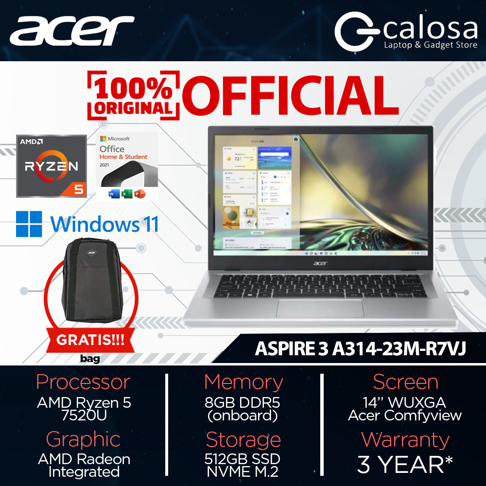 ACER ASPIRE A314-23M-R7VJ RYZEN 5-7520U 14” UMA WIN 11 PURE SILVER